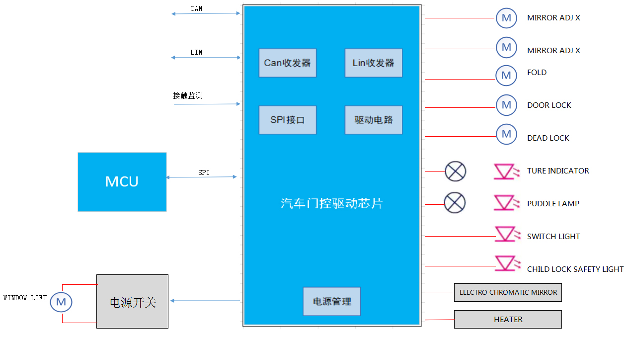 國芯門控驅(qū)動芯片支持車門所有負(fù)載的驅(qū)動,包括后視鏡調(diào)節(jié)、后視鏡折疊、后視鏡加熱、車門上鎖、車窗升降和防眩光控制,內(nèi)置電源管理、CAN/Lin收發(fā)器和熱管理單元等模塊,具有高集成度高,高可靠性的特點(diǎn)。配合國芯MCU,為車門控制器模塊提供極具競爭力的解決方案。